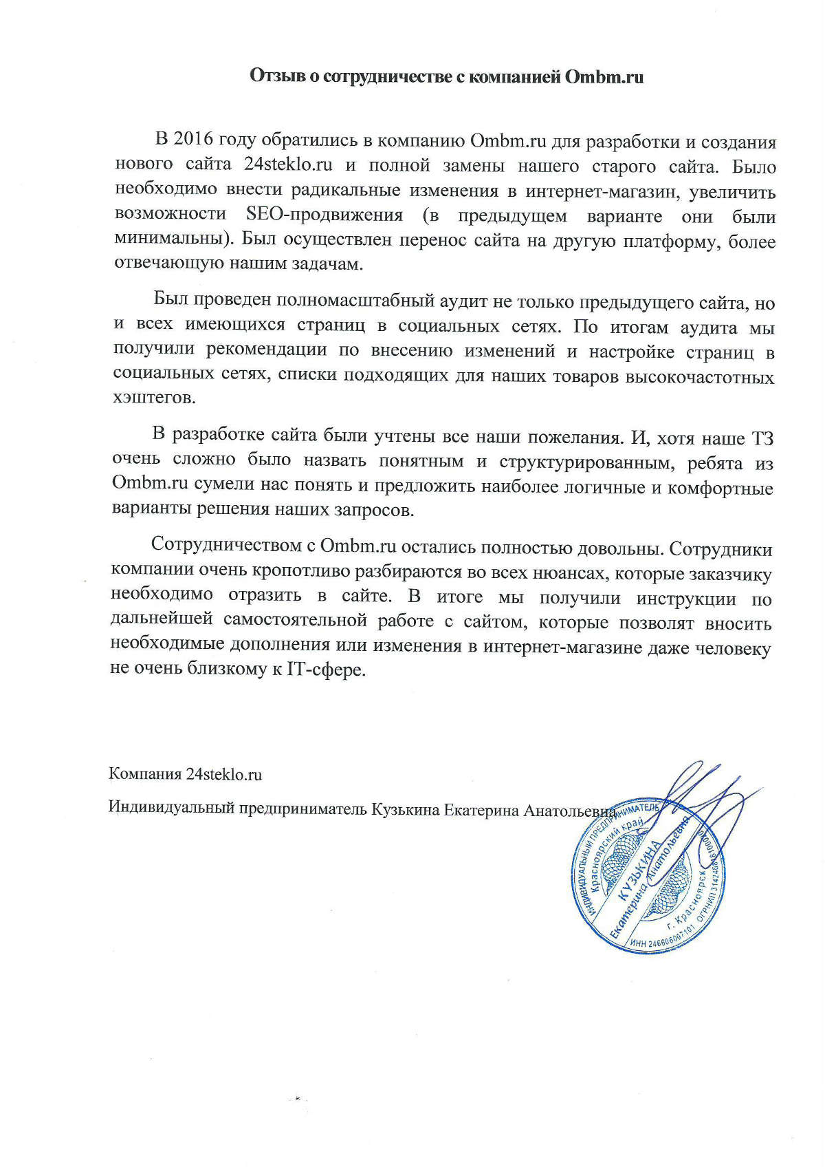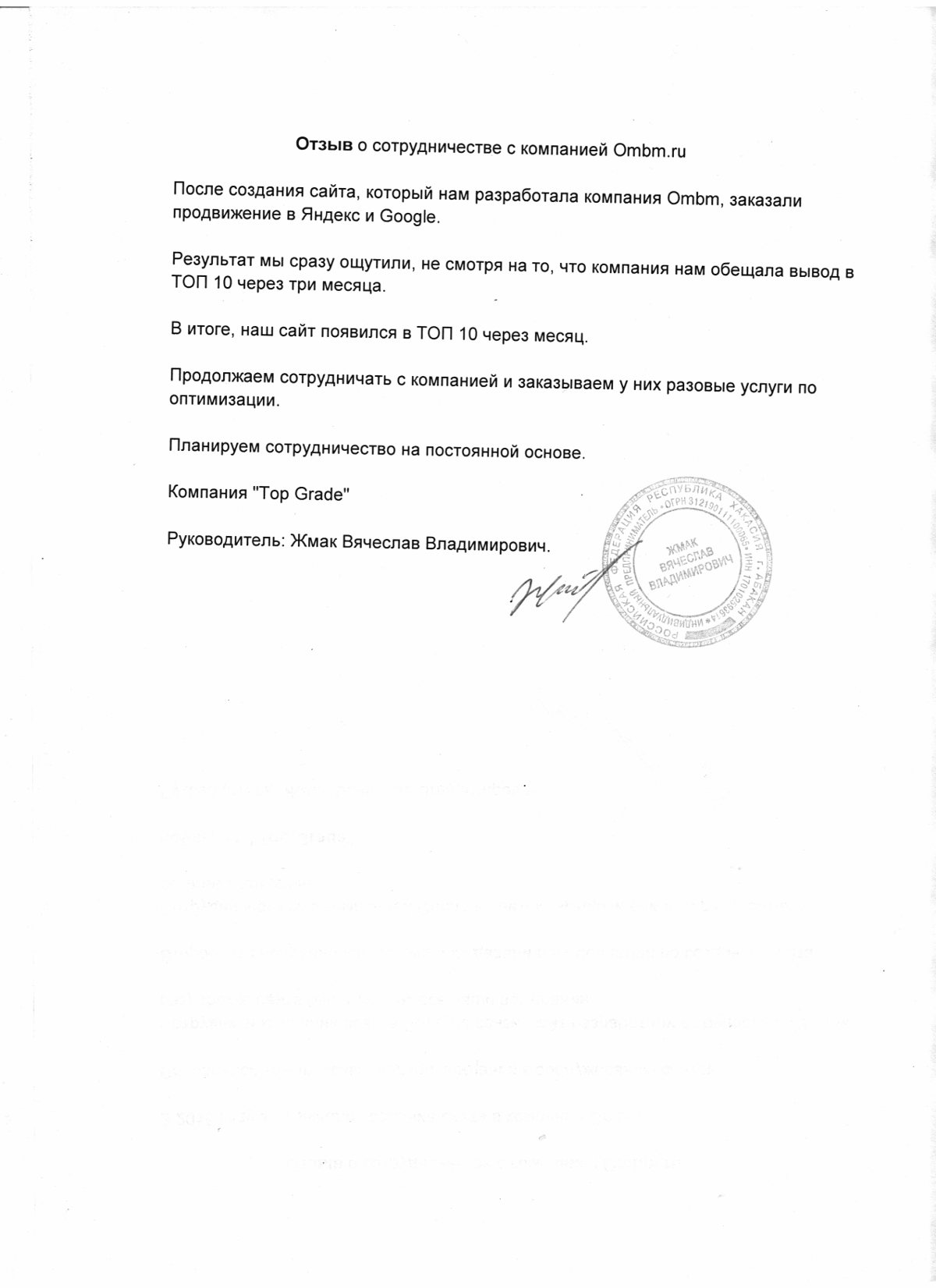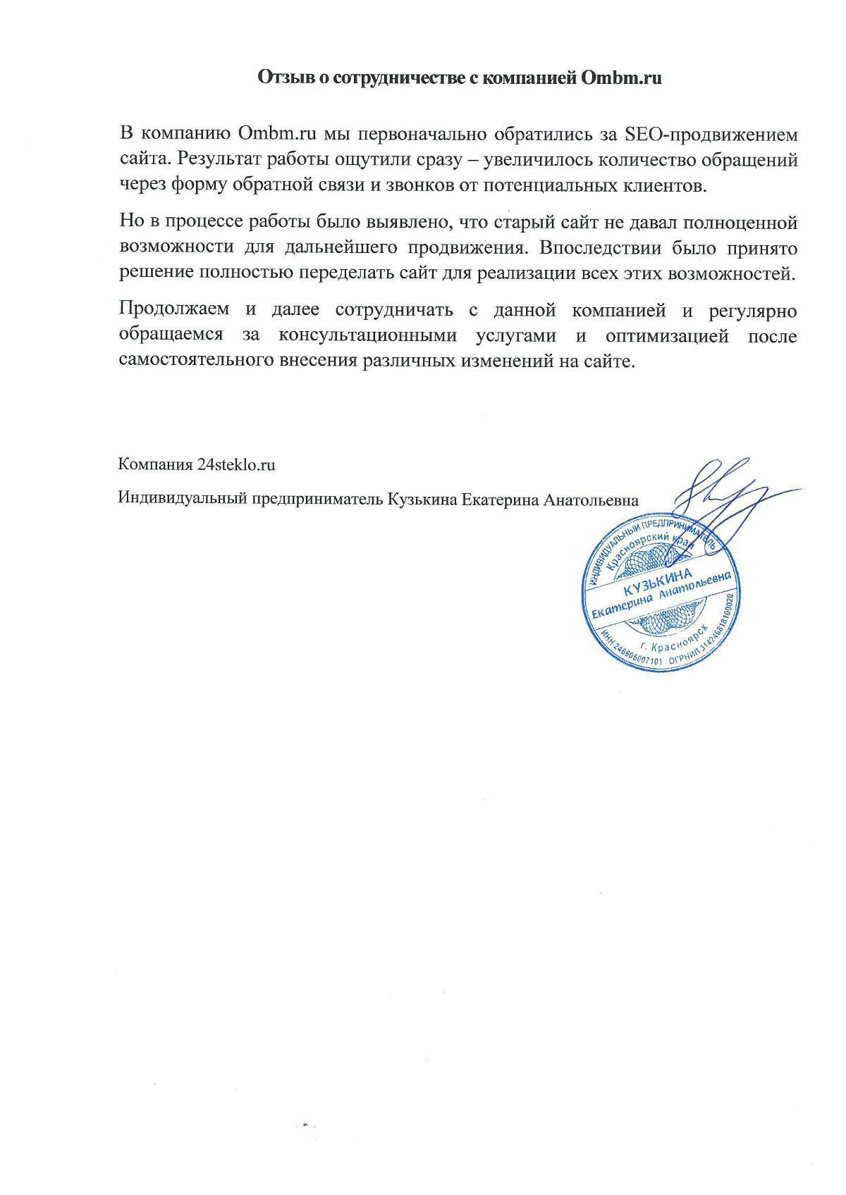 “ В компанию Ombm мы обратились в мае 2017 года за продвижением в ТОП Яндекс и Google сайта. Так как мы обратились по рекомендации нам предоставили скидку в размере 25%. Перед тем, как приступить к работе был проведен аудит сайта и даны рекомендации по улучшению его. Как и обещали через 2 месяца наш сайт был в ТОП-10, что не могло не порадовать, так как ранее сотрудничали с несколькими компаниями и результат, мягко говоря, был нулевой, хотя услуги очень дорогостоящие. После увиденного результата мы решили заключить договор на сопровождение сайта. В дополнение ко всему на сайте были проведены некоторые доработки по улучшению функционала, написаны статьи."