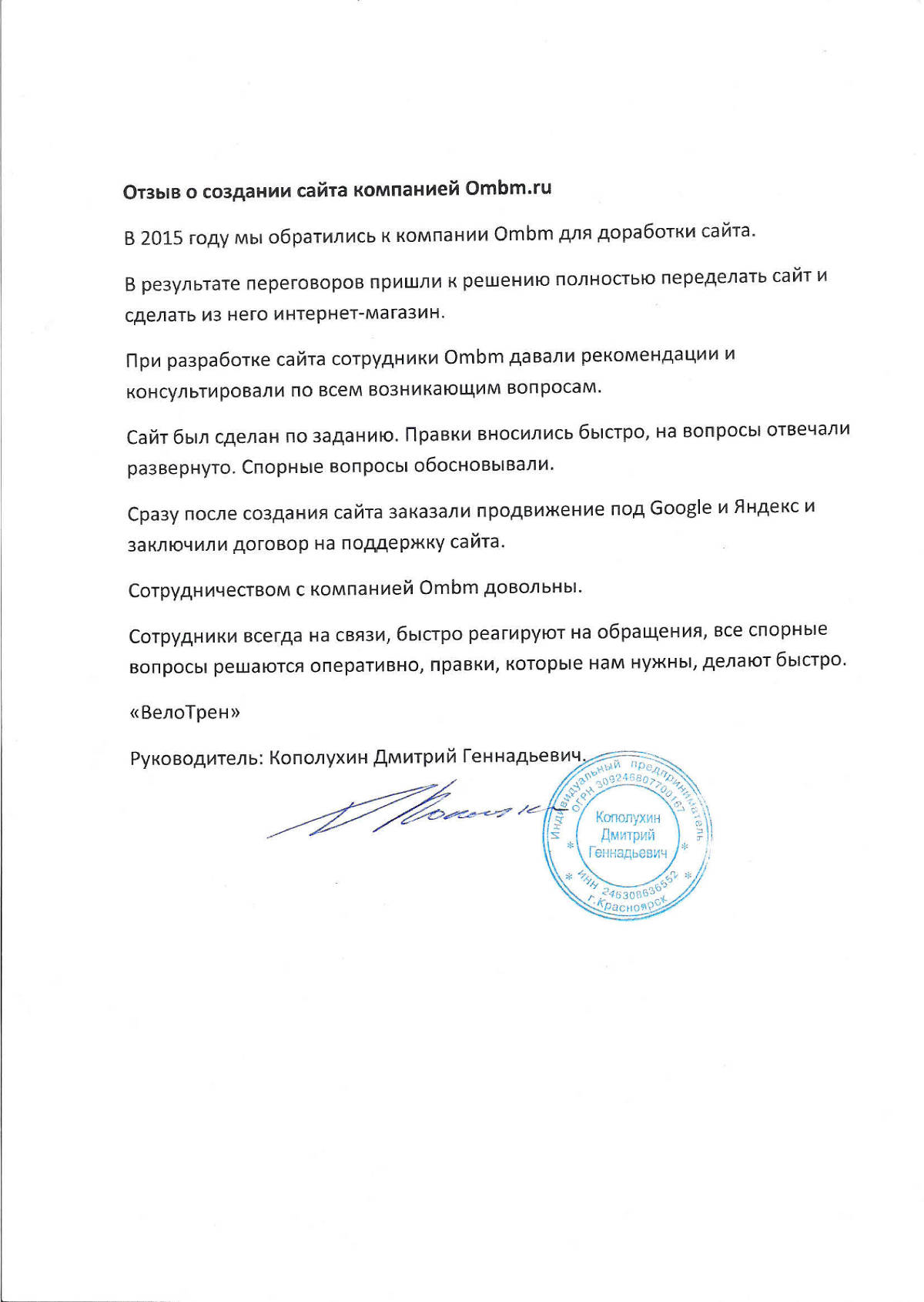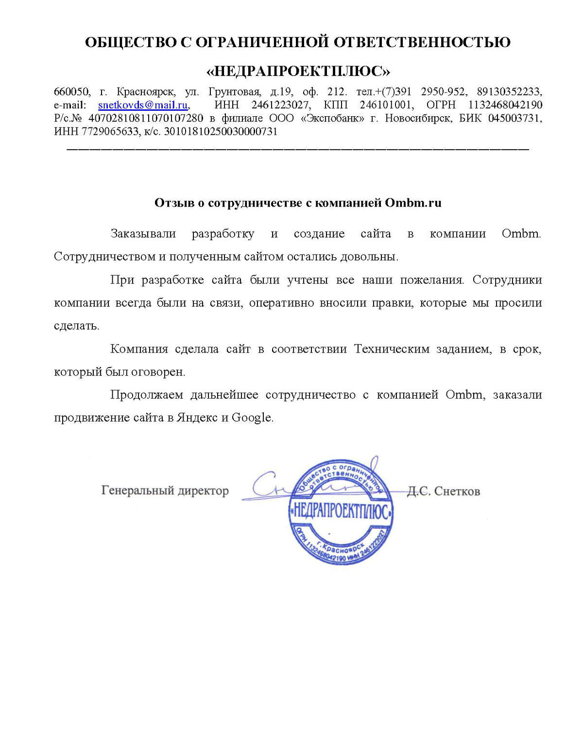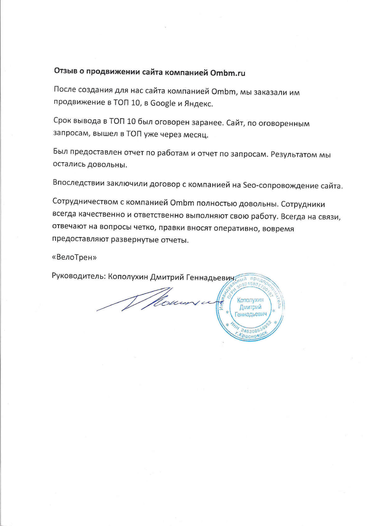 “ В компанию Ombm мы обратились в мае 2017 года за продвижением в ТОП Яндекс и Google сайта. Так как мы обратились по рекомендации нам предоставили скидку в размере 25%. Перед тем, как приступить к работе был проведен аудит сайта и даны рекомендации по улучшению его. Как и обещали через 2 месяца наш сайт был в ТОП-10, что не могло не порадовать, так как ранее сотрудничали с несколькими компаниями и результат, мягко говоря, был нулевой, хотя услуги очень дорогостоящие. После увиденного результата мы решили заключить договор на сопровождение сайта. В дополнение ко всему на сайте были проведены некоторые доработки по улучшению функционала, написаны статьи."