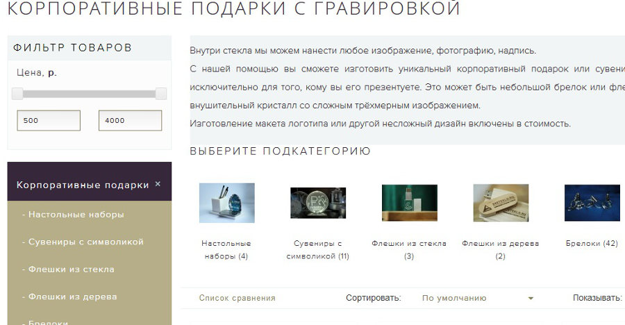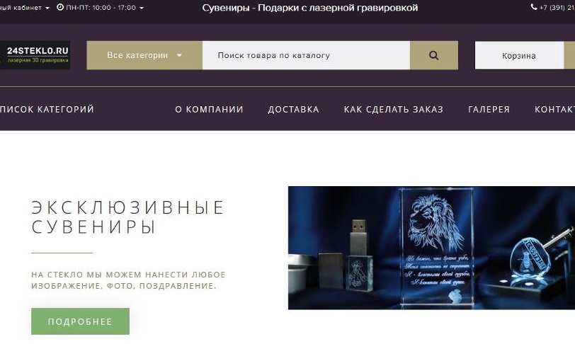 Компания занимается гравировкой внутри стекла. Изготавливает корпоративные сувениры, индивидуальные и эксклюзивные сувениры, призы, награды. В 2017 году компания обратилась к нам за продвижением сайта. До этого у компании был интернет-магазин на констукторе NetHouse. Данный констуктор имеет ограниченные возможности для продвижения и модернизации. Сайт устарел по дизайну, имел неудобный заказ. По итогам аудита было принято решение перенести сайт на CMS. Договор был заключён не только на создание, но и на перенос всех товаров.