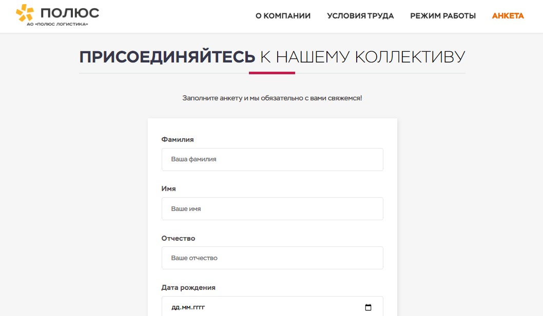 Одностраничный сайт для сбора анкет для трудоустройства.