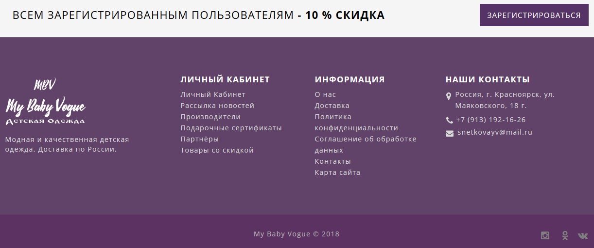 После создания и наполнения сайт был передан на Seo-продвижение. Компания «My Baby Vogue» сразу заключала договор на создание и продвижение в ТОП 10 Яндекса и Google, поэтому получила скидку на продвижение в размере 15%. Наполнение товарами было включено в стоимость договора разработки.
