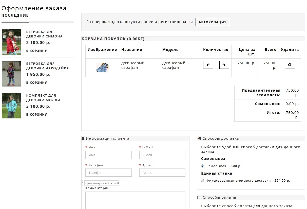 Компания занимается продажей модной детской одежды в городе Красноярск и осуществляет доставку по России. В 2017 году компания обратилась к нам за созданием сайта. Было предложено создать интернет-магазин. Договор был заключён не только на создание, но и на наполнение сайта товарами, а также дальнейшее продвижение.